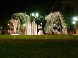 De noche se encienden las luces y activan las aguas danzantes. En el centro hay una pareja de bailarines. Él, hincado, recibe a su Odette en puntas de pie. La escultura detiene el acontecimiento de sus muertes prematuras.